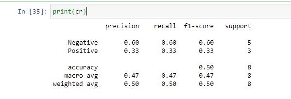 predict = ["Negative", "Negative" , "Negative", "Positive" ,"Positive","Positive", "Negative","Positive"]