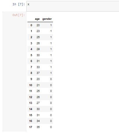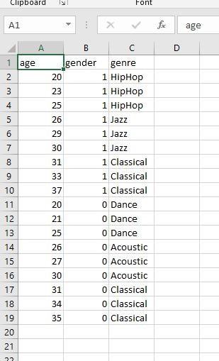 یه سری دیتاست که ستون اول سن ستون دوم جنسیت و ستون سوم سبک موزیکی که دوس دارن گوش کنن رو میده (فرض کن یه سری داده است که رفتن نظر سنجی کردن نوشتن)